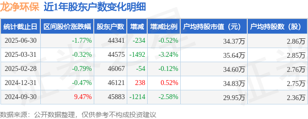 从股价来看,2025年3月31日至2025年6月30日,龙净环保区间跌幅为1.77%,在此期间股东户数减少234.0户,减幅为0.52%。